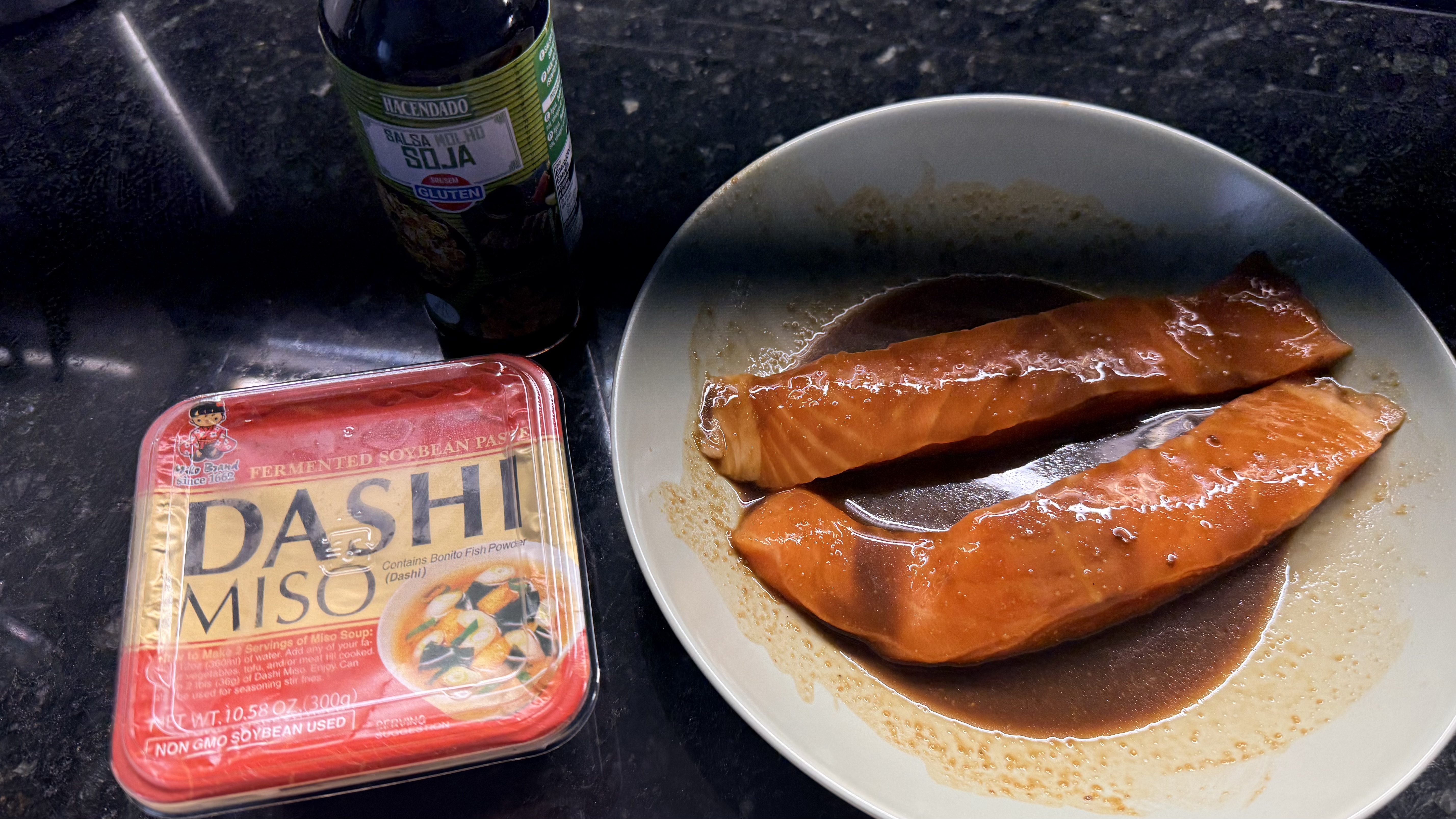 1. Whisk brown sugar, soy sauce (or aminos or tamari to be gluten-free), water, and miso paste in a bowl until combined.